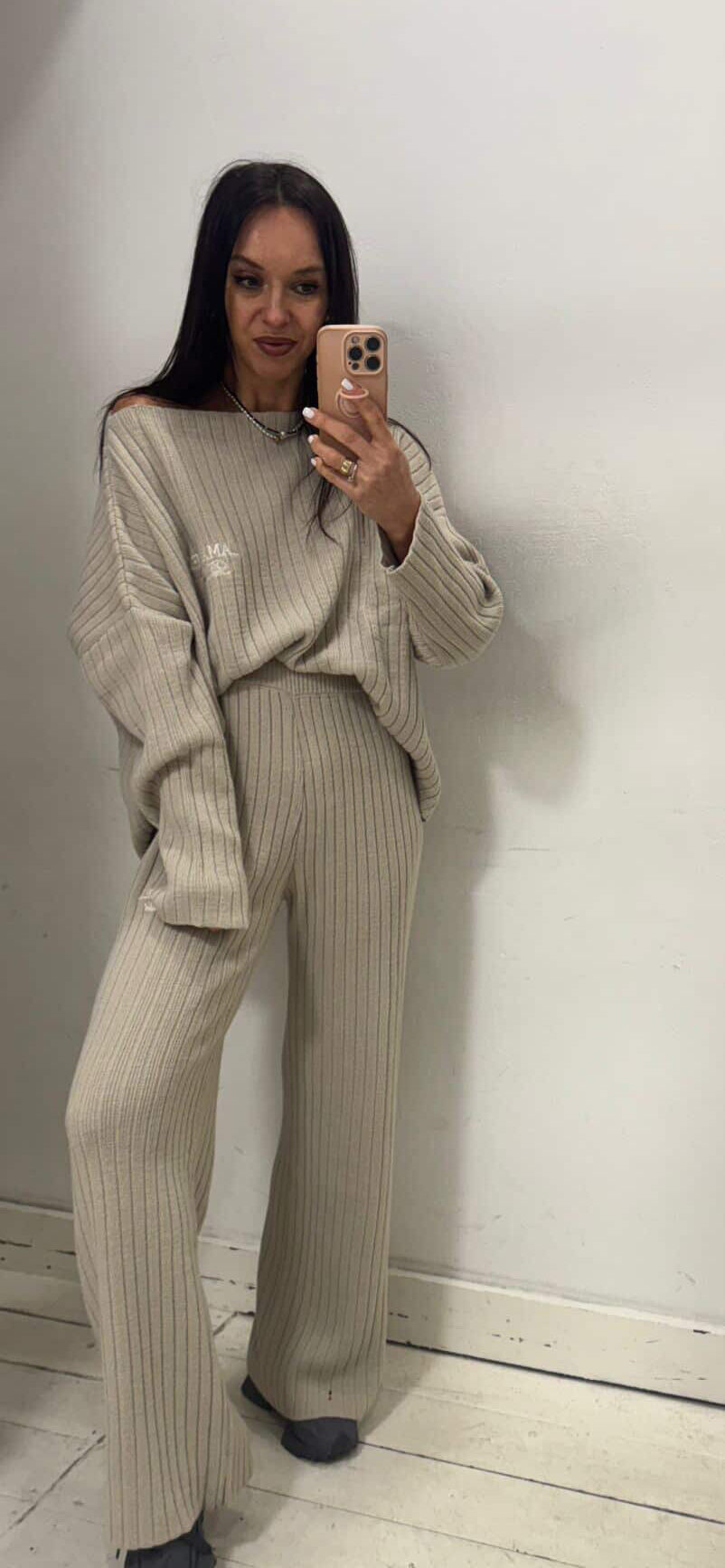 Komplet Dzianinowy La Manuel Sara to idealny wybór na każdą okazję. Składa się z bluzki oraz spodni. Bluzka z długim rękawem i delikatnym logo. Dekolt w łódkę sprawia, że możemy nosić ją także na jedno ramię. Spodnie o prostym kroju, posiadają gumę w talii. Pięknie dopasowują się do ciała. Cały komplet prezentuje się świetnie! Miękki i miły w dotyku materiał. Z pewnością podbije Wasze serca! Polski Produkt Premium.